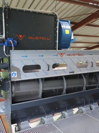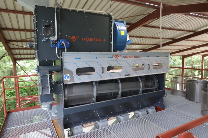 MUSITELLI kombinētā graudu tīrīšanas/šķirošanas mašīna ar rotējošo sietu atdala labos graudus no bojātajiem graudiem, mazajiem un lielajiem piemaisījumiem, kā arī vieglie piemaisījumi tiek noņemti ar aspirāciju.